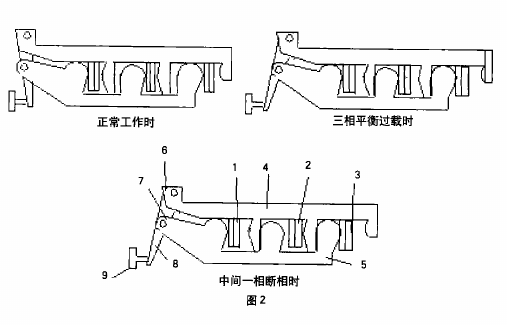 選取帶缺相保護的熱繼電器。JR16系列及JR20系列熱繼電器帶缺相保護。既可作三相過載保護,又有缺相運行保護。熱繼電器雙金屬熱元件1、2、3串接在主電路中,當過載電流達到整定值時,雙金屬片彎曲較大,把外導板5和杠桿8推向左面,繼電器動作。(見圖2)當一相斷相時,該相熱元件溫度由正常發(fā)熱狀態(tài)下降,雙金屬片伸直,推動內(nèi)導板4右移,而另二相因電流增大,雙金屬彎曲加大,加劇外導板5左移,使杠桿扭轉(zhuǎn),加速觸頭分離,起斷相保護作用。(1、2、3雙金屬熱元件,4內(nèi)導板,5外導板,6、7鉸鏈,8杠桿)。