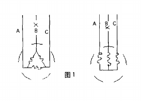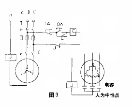 零序電壓缺相保護。在中性點接地的三相系統(tǒng)中,正常運行的電機是三相負載平行的,三相電動勢之和為零,中性點沒電壓。當發(fā)生缺相運行,定子繞組三相電壓極度不平行,從而產(chǎn)生零序電壓,升高可達到25一4 SV。利用這個電壓,可用一個24V的小型中間繼電器作零序保護,使串聯(lián)在控制電路的中間繼電器常閉觸頭J斷開,切斷電源。對于△型接法的電機,可利用接在電機三條引出線上的電容器接成△型,作人為中性點,(見圖3)電容中性點器選取耐壓4OOV,2uf即可。