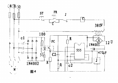 電子式缺相保護。市面上有多種利用集成電路制成的電子式缺相保護。其中一種用555時基電路組成的單穩(wěn)態(tài)電路,具有制作容易、靈敏度高、工作可靠的特點。電路見(圖4)。這種電路是利用三相全波整流輸出的電流是否連續(xù)不斷來作電機保護。正常情況下,三相全波整流輸出電流連續(xù),不出現(xiàn)零電流點。PC輸人連續(xù)電流、輸出端一直導通。555集成電路第2腳高電位,第4和6腳在開機延時作用復位。第3,7腳輸出低電平,繼電器Jl不動作。缺一相后、三相全波整流變單相全波整流輸出,有電流零點出現(xiàn)。當電流為零時,PC輸出截止,555第2腳出現(xiàn)下跳脈沖置位、第3,7腳輸出高電平,繼電器J1吸合,使電機失電保護。